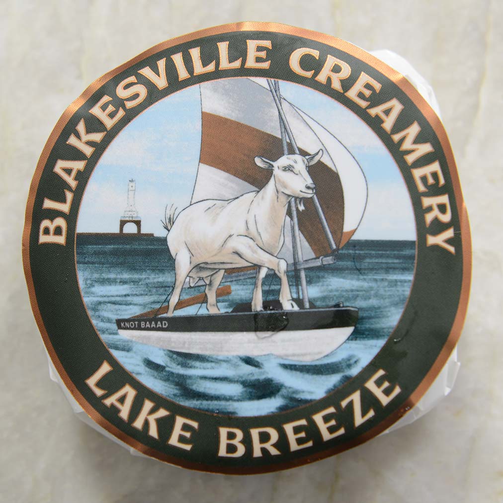 Lake Breeze is a semi-soft goat cheese with a geotrichum rind. It is bright and citrusy with tangy and mineral notes and a rich, dense mouthfeel.