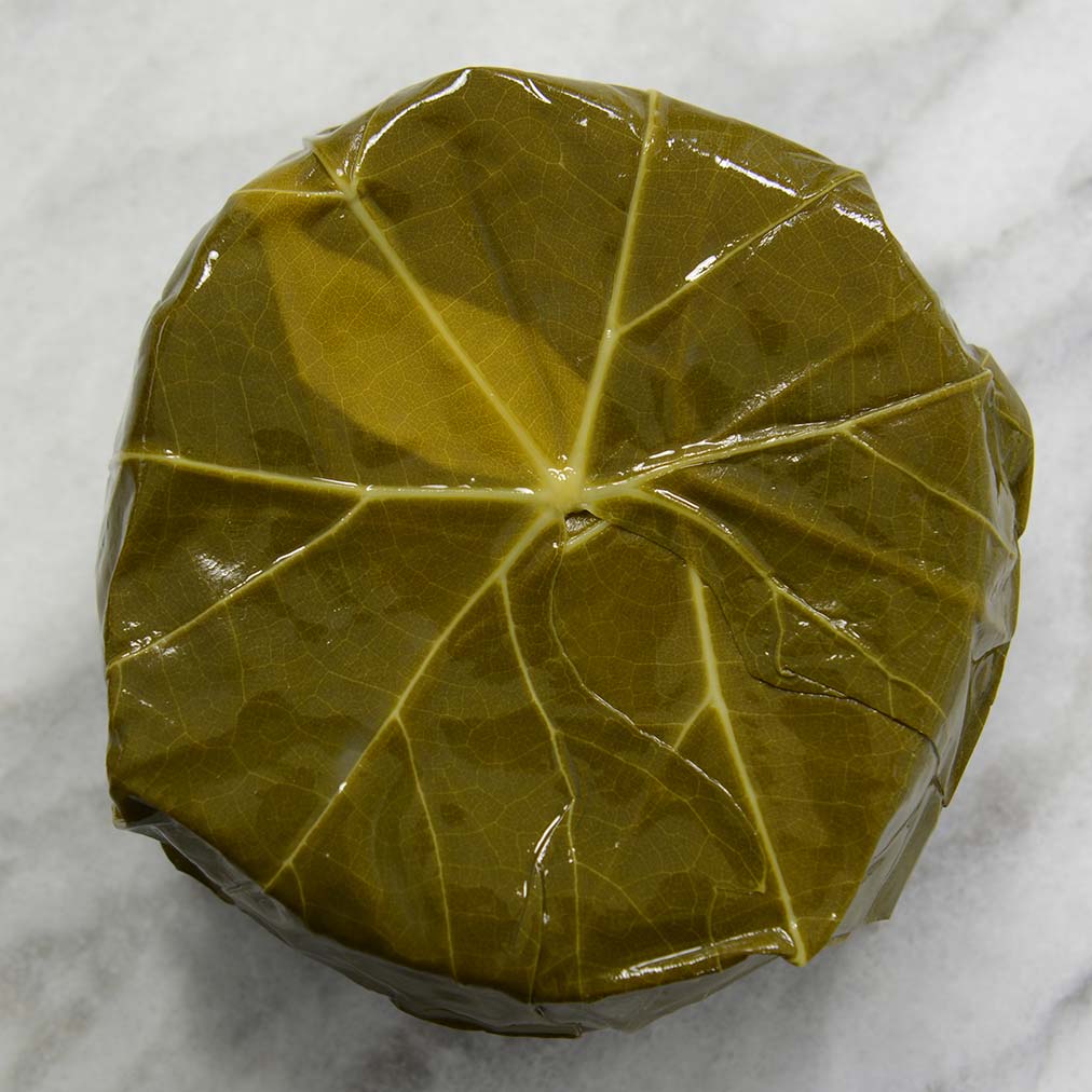 Pecuri in i Vigni is a disk of fresh sheep milk wrapped in white wine-soaked grape leaves. Fittingly, the name translates to "sheep in the vineyard." The cheese texture is fluffy and soft, but also dense and silky. The sheep milk is rich and creamy, with a natural sweetness that is counterbalanced by the fruity and floral notes from the wine.