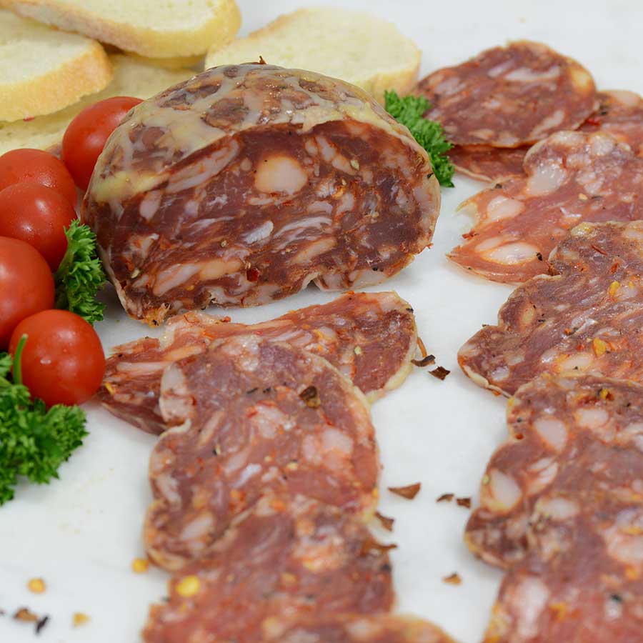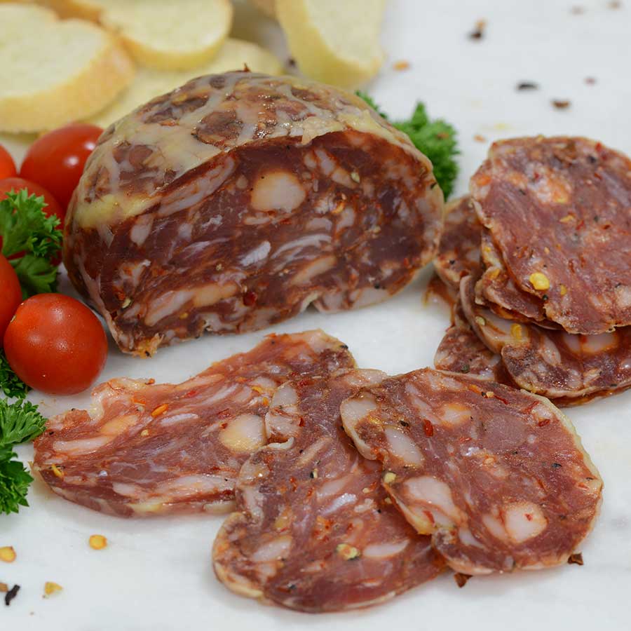 Delaware Fireball is a crepinette of pork, Calabrian chilies and Espellette Pepper wrapped by hand in Caul-fat. It is dry aged and cold-smoked over Hickory. The heat profile will enhance any fish, seafood or may be sliced on top of flat bread, for charcuterie plates, sandwiches, etc